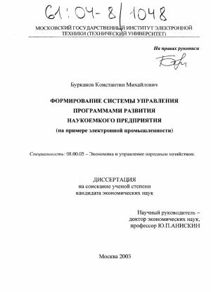 1.3 Методические основы построения систем управления программами развития Глава 2. Разработка концепции и механизма комплексного управлении программами развития наукоемкого предприятия.