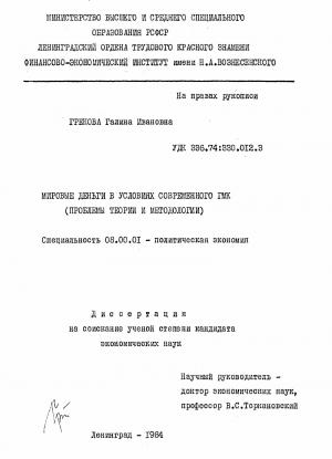 Глава I. МИРОВЫЕ ДЕНЬГИ И ОСОБЕННОСТИ ИХ ФУНКЦИОНИРОВАНИЯ В СОВРЕМЕННЫХ УСЛОВИЯХ