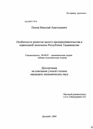 необходимое условие и специфика становления малого предпринимательства в переходной экономике Республики Таджикистан.