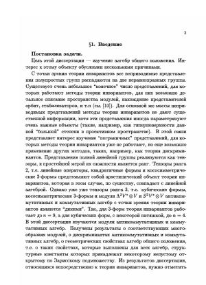 С точки зрения теории инвариантов все неприводимые представления полупростых групп распадаются на две неравноправных группы. Существует очень небольшое “конечное” число представлений, для которых работают методы теории инвариантов, для них возможно детальное описание пространства модулей, нахождение представителей орбит, стабилизаторов, и т.п (см. [10]). Для основной же массы неприводимых представлений методы теории инвариантов не дают существенной информации, хотя эти представления иногда параметризуют очень важные объекты (такие, например, как гиперповерхности данной “большой” степени в проективном пространстве). В этой связи представляет интерес изучение “пограничных” представлений, для которых методы теории инвариантов уже не работают, но еще возможно применение других методов, таких, например, как теория дискриминантов. Представления полной линейной группы реализуются как тензоры, и простейшей мерой их сложности является ранг. Тензоры ранга 2, т.е. линейные операторы, квадратичные формы и кососимметрические 2-формы представляют собой архетипический объект теории инвариантов, которая в этом случае, по существу, совпадает с линейной алгеброй. Однако уже уже тензоры ранга 3, т.е. кубические формы, кососимметрические 3-формы и модули Л2У* 0 V и52У*^)У антиком-мутативных и коммутативных алгебр с точки зрения теории инвариантов являются “дикими”. Так, для 3-форм теория инвариантов работает до п = 9, а для кубических форм, с некоторой натяжкой, до п = 4. В этой диссертации изучаются модули антикоммутативных и коммутативных алгебр. Получены результаты о соответствующих многообразиях модулей, о дискриминантах антикоммутативных и коммутативных алгебр, о геометрических свойствах алгебр общего положения, т.е. о таких свойствах, которые выполнены для всех алгебр, структурные константы которых принадлежат некоторому непустому открытому по Зарисскому подмножеству. Из результатов диссертации, относящихся непосредственно к теории инвариантов, нужно отметить